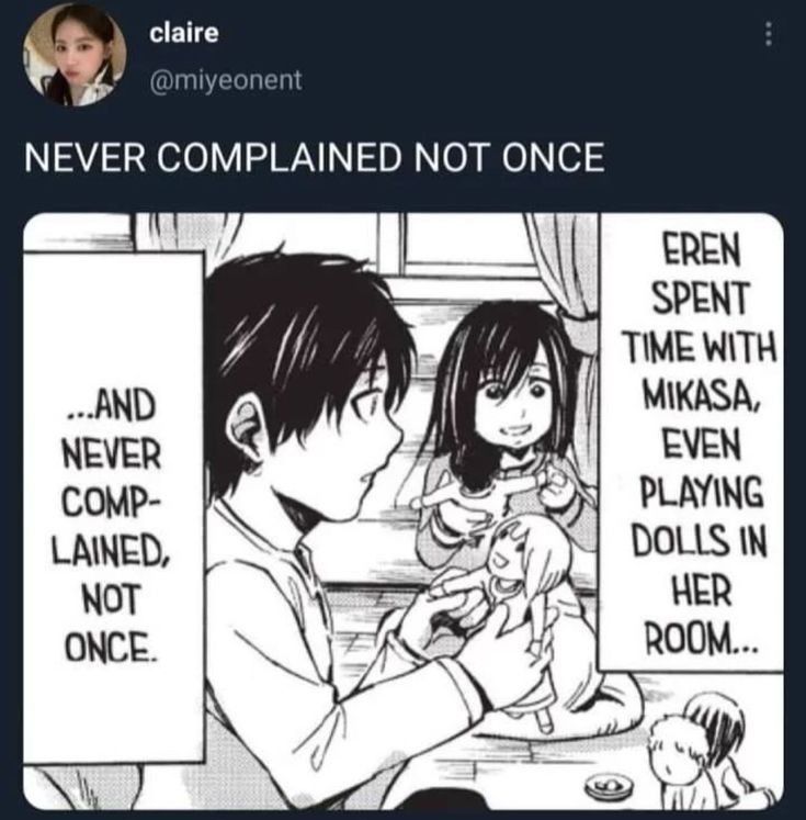 I watched the OVA where Mikasa lives in an alternate reality where her parents don’t die and OmgGG !!!!!! It’s like the ending to aot was planned from the beginning !!!!! (it’s been confirmed it was) but what I am trying to say is that every detail was probably planned in regards to the beginning and end of the story and it was probs more about filling in the stuff in the middle for Isayama :3 anyway I may also read the manga version of the OVA (where the pic above is from) cuz it looks so cuteeee <3333